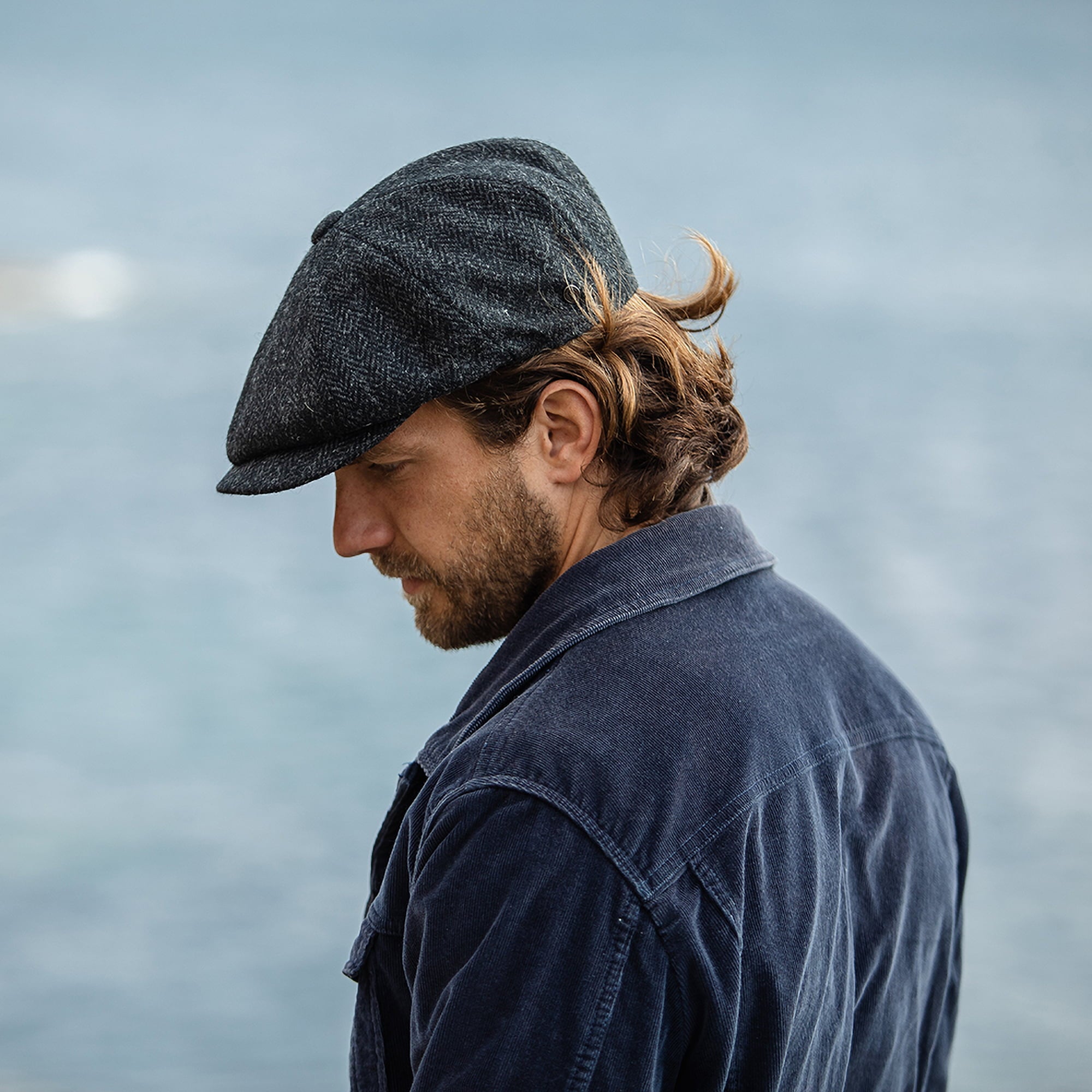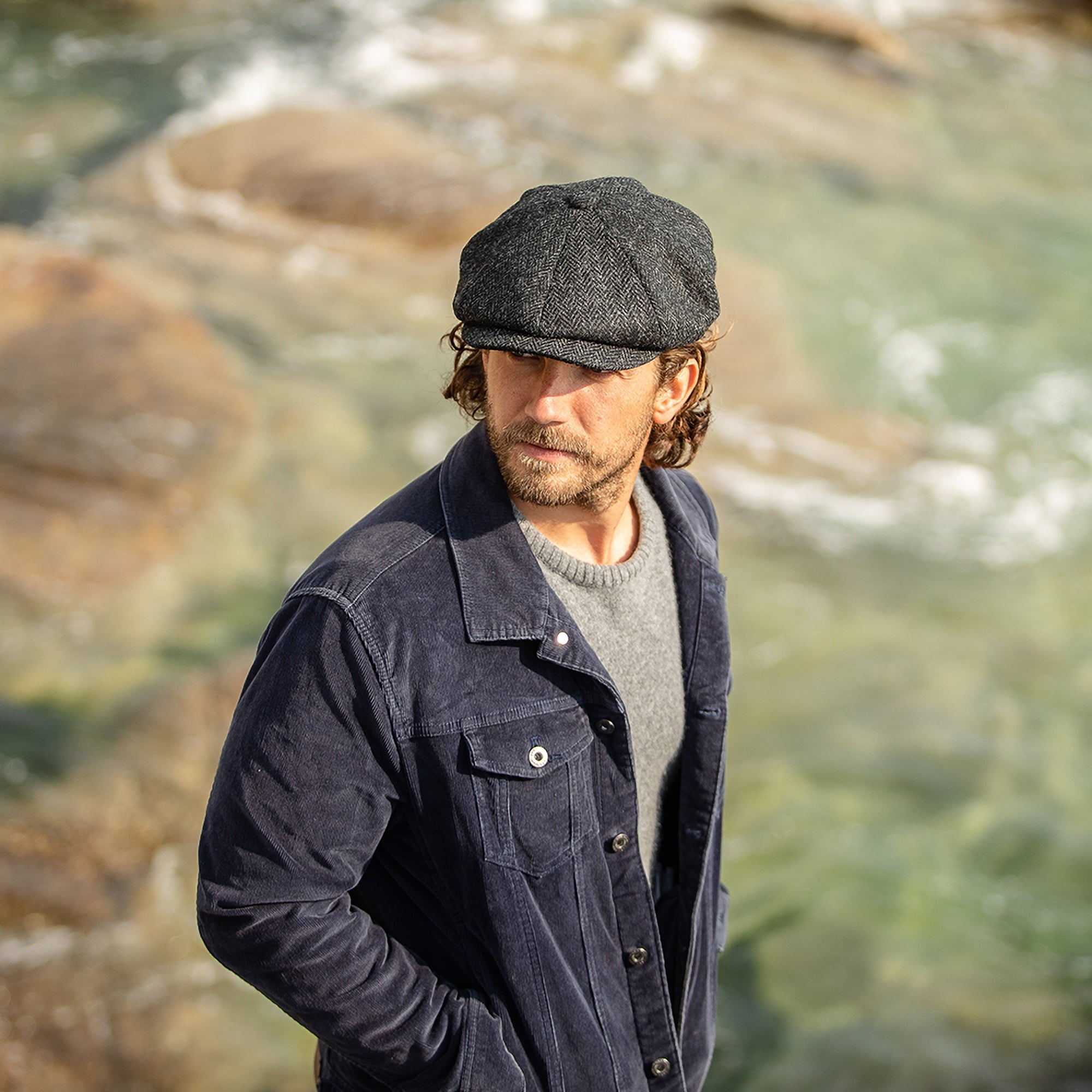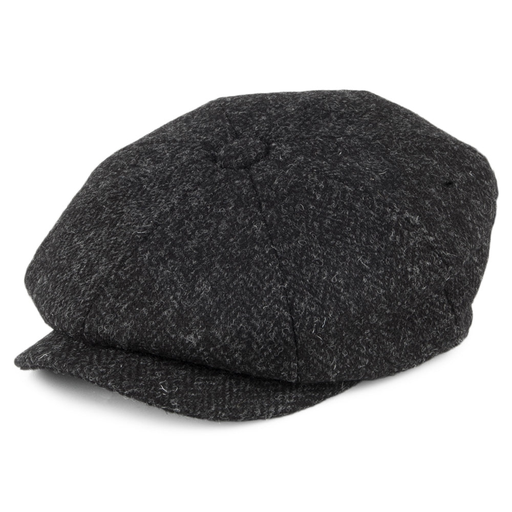 Black-Charcoal Pure New Wool Newsboy Cap is finished with grosgrain sweatband and decorative side pin.