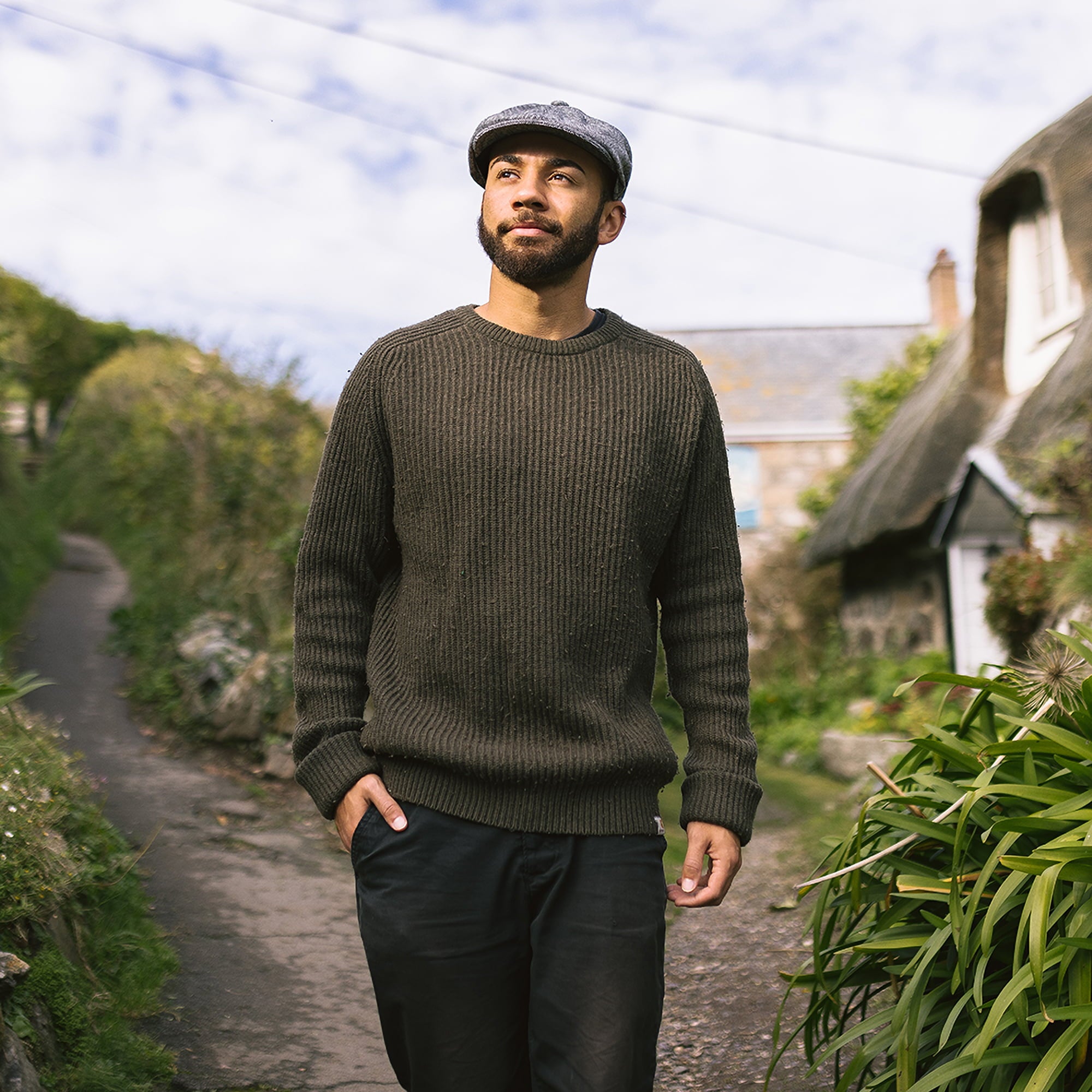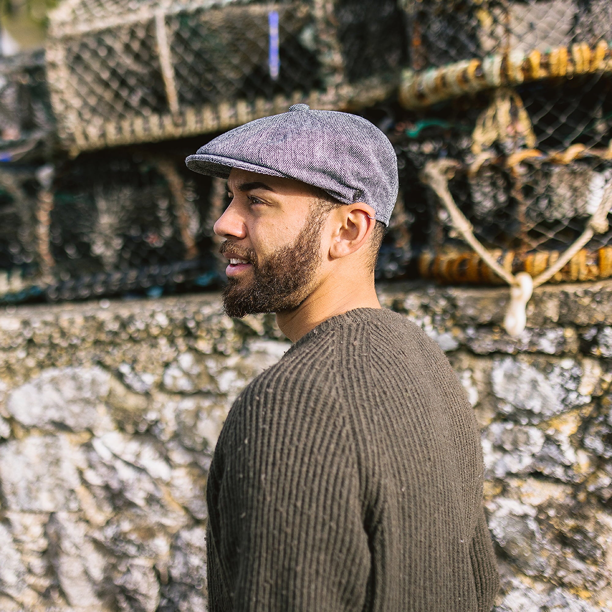 Black Marl Tweed Newsboy Cap is finished with grosgrain sweatband and decorative side pin.