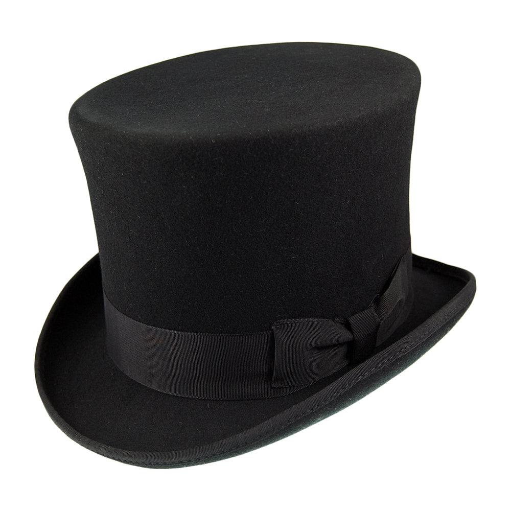 Black Tall Crown Wool Felt Top Hat is crafted from 100% wool felt and finished with faux leather sweatband and grosgrain hatband and edging.