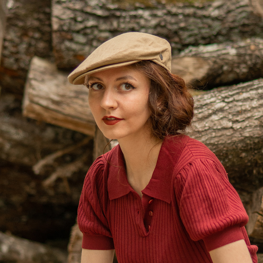 Camel Linen Flat Cap is crafted from 100% linen and finished with grosgrain sweatband and decorative side pin.