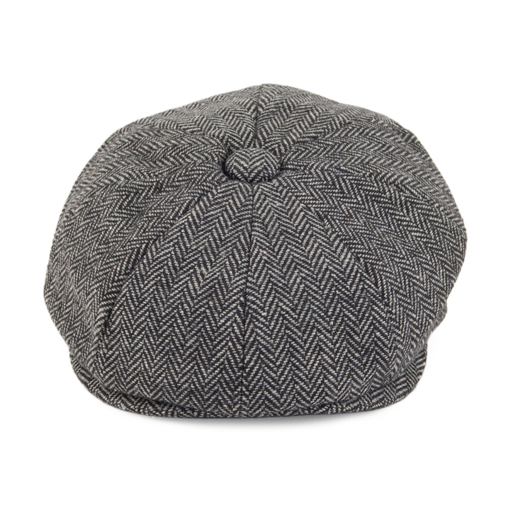 Charcoal Baby Herringbone Newsboy Cap is crafted from 60% polyester, 40% wool and finished with grosgrain sweatband and sewn down brim.
