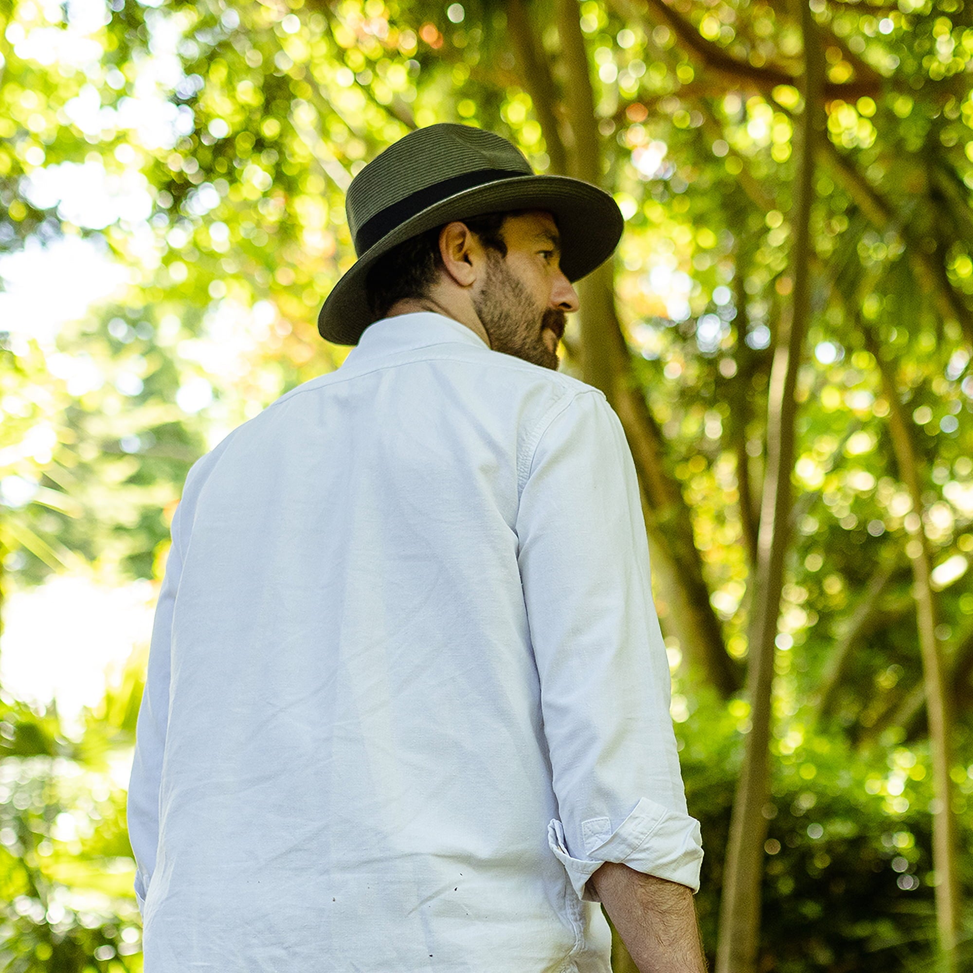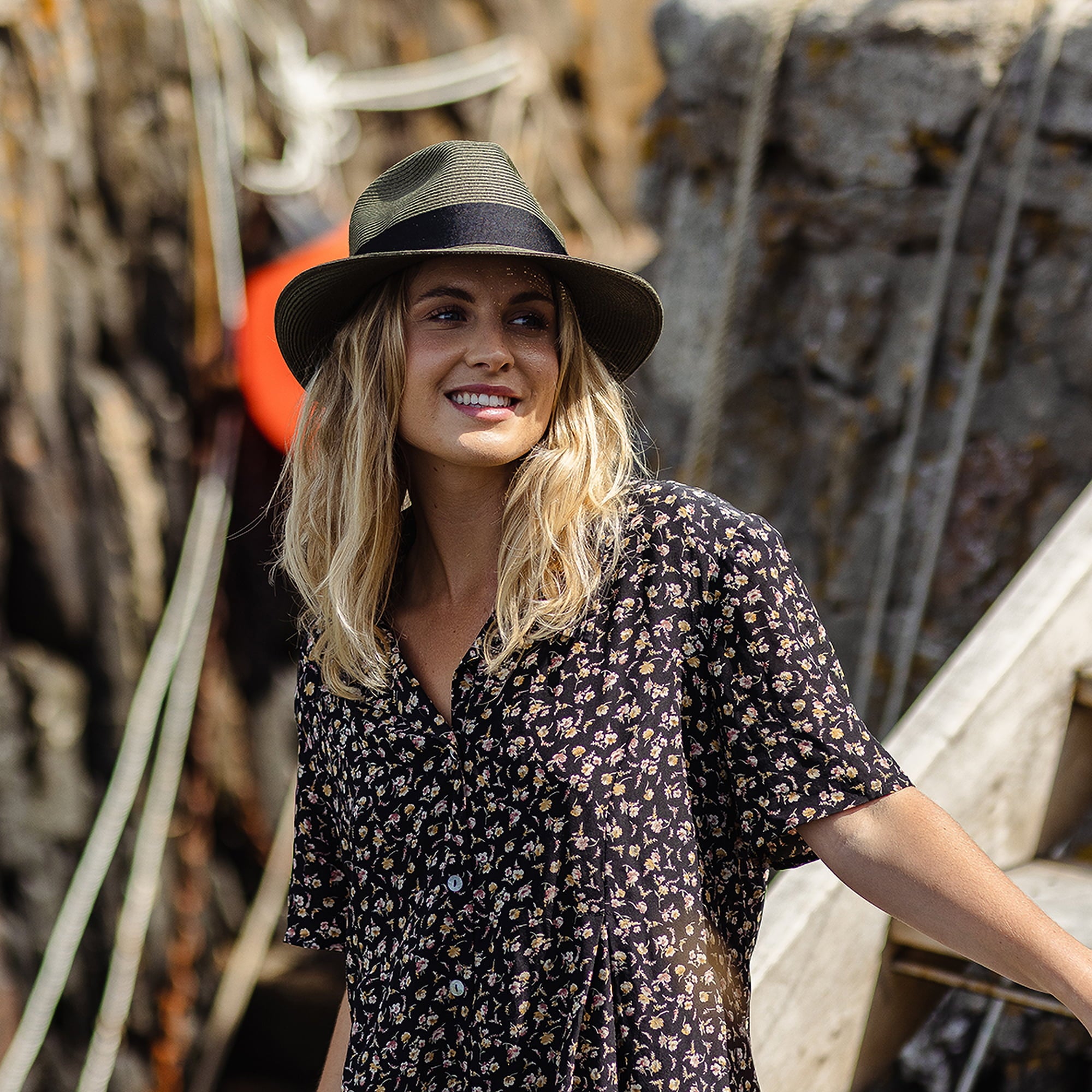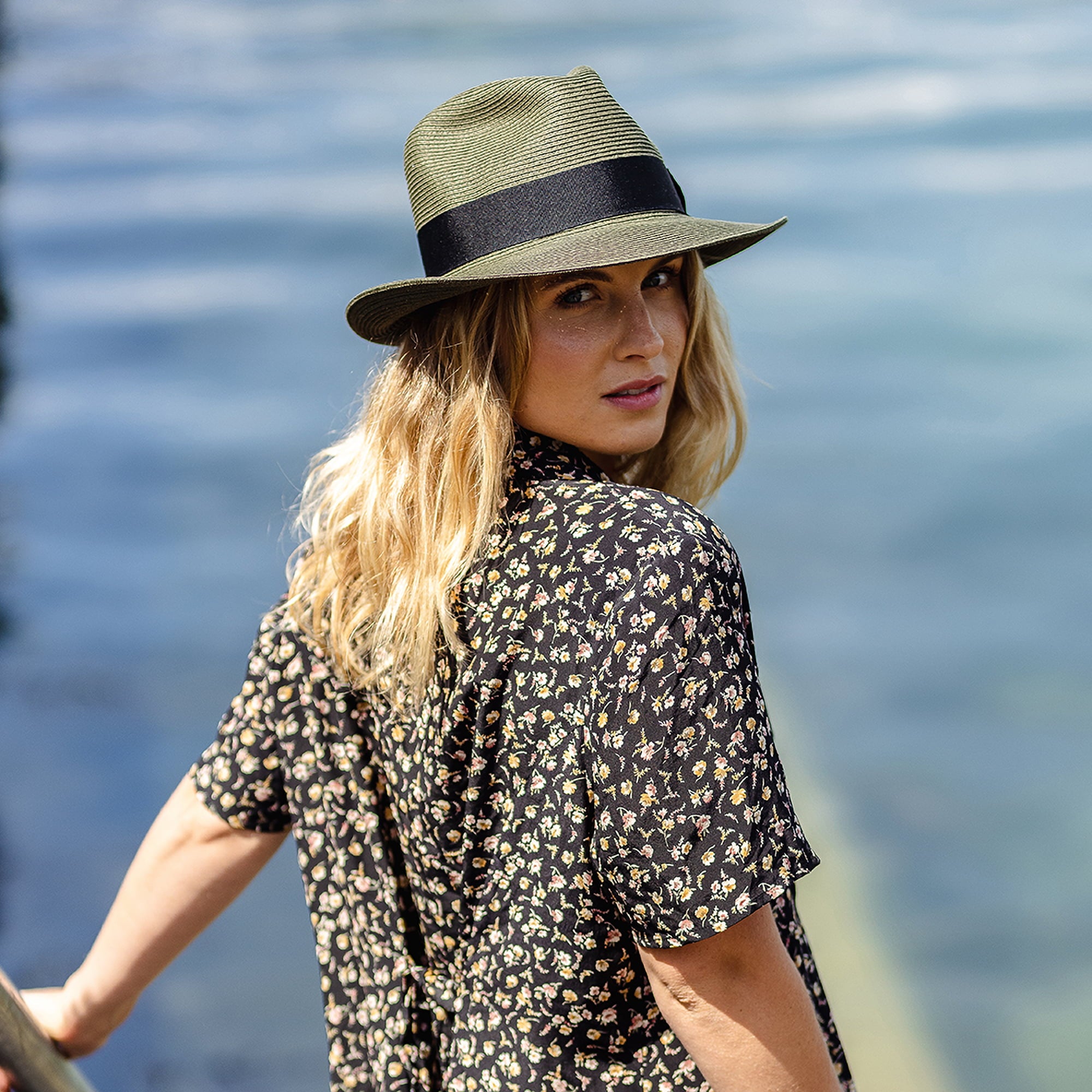 Olive Summer C-Crown Straw Fedora Hat is crafted from 100% toyo straw and finished with elasticized terrycloth sweatband and grosgrain hatband.